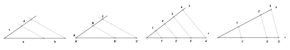 A partir de un extremo de un segmento, se traza una semirrecta sobre la que se marcan tantas divisiones iguales como partes en las que se quiera dividir el segmento. Unimos el último punto con el extremo del segmento y se trazan paralelas a esta recta por las divisiones obtenidas quedando así el segmento dividido en partes iguales (Fig.3).